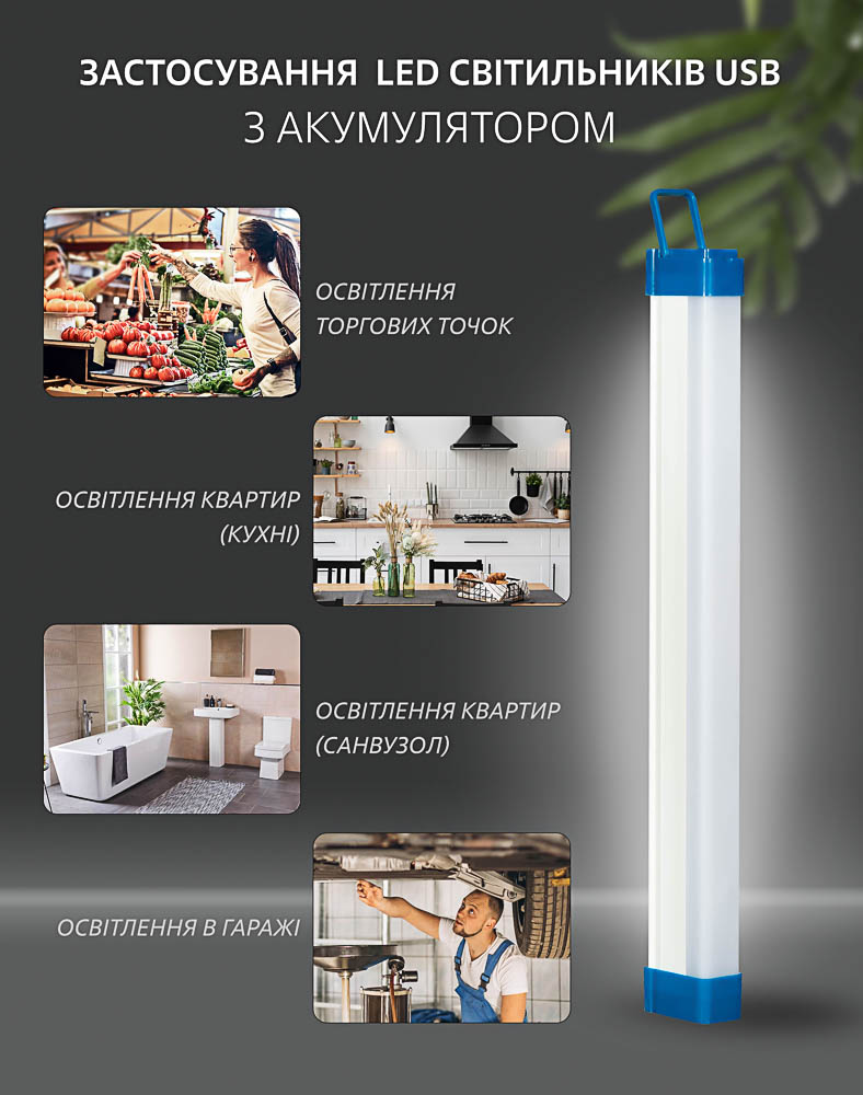 Портативний акумуляторний світильник чудово підійде для освітлення під час виїздів на природу, в гаражі, підсвічування торгових точок. LED світильник має 3 режими роботи (яскравий, середній і стробоскоп). Час роботи світильника на одному заряді може досягати 6,5 годин.