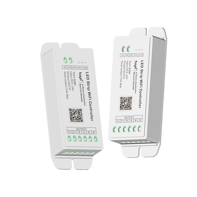Вихідний струм LED контролер DC5-24V Tuya WiFi Beacon 05 Series RGBW controller складає 6А на канал, має 1-5 каналів, живиться від блоків живлення 5-24V стабільного електричного струму.