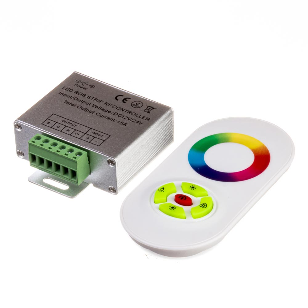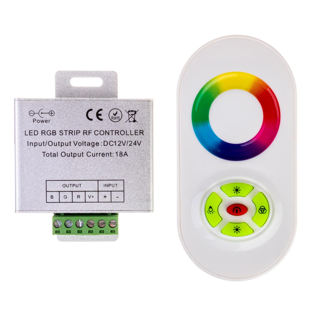 У пам’яті цього RGB контролера залишається остання програма, що застосовувалася до виключення живлення. Ви завжди зможете правильно настроювати відтінок кольору світіння за допомогою сенсорного кільця на пульті. Даний контролер йде в комплекті з сенсорним радіо пультом білого кольору. Іншими словами, даний контролер — це якісний аксесуар для регулювання кольору та режиму світіння led RGB стрічки.