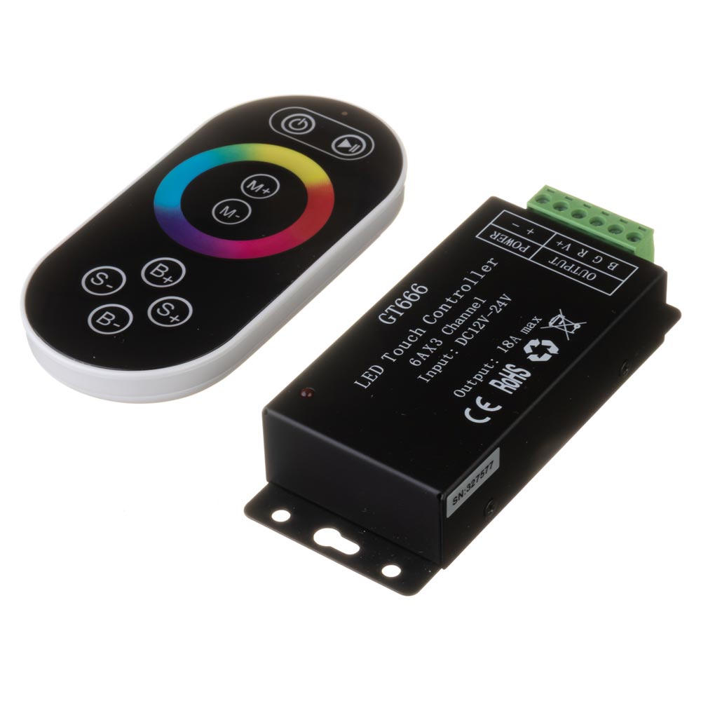 Даний контролер, з завантаженими в пам’ять програмами, іменується RGB з контролером. Виріб містить три канали — червоний (R), зелений (G), синій (B) і призначене для управління RGB led продуктами. Зважаючи на це, продукт коннектіться до світлодіодних модулів або RGB доданими модулів, світлодіодної стрічки RGB. Харчування на контролер подається зі стабілізованого блоку живлення 12V.