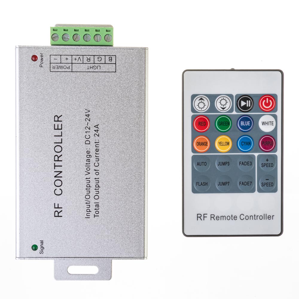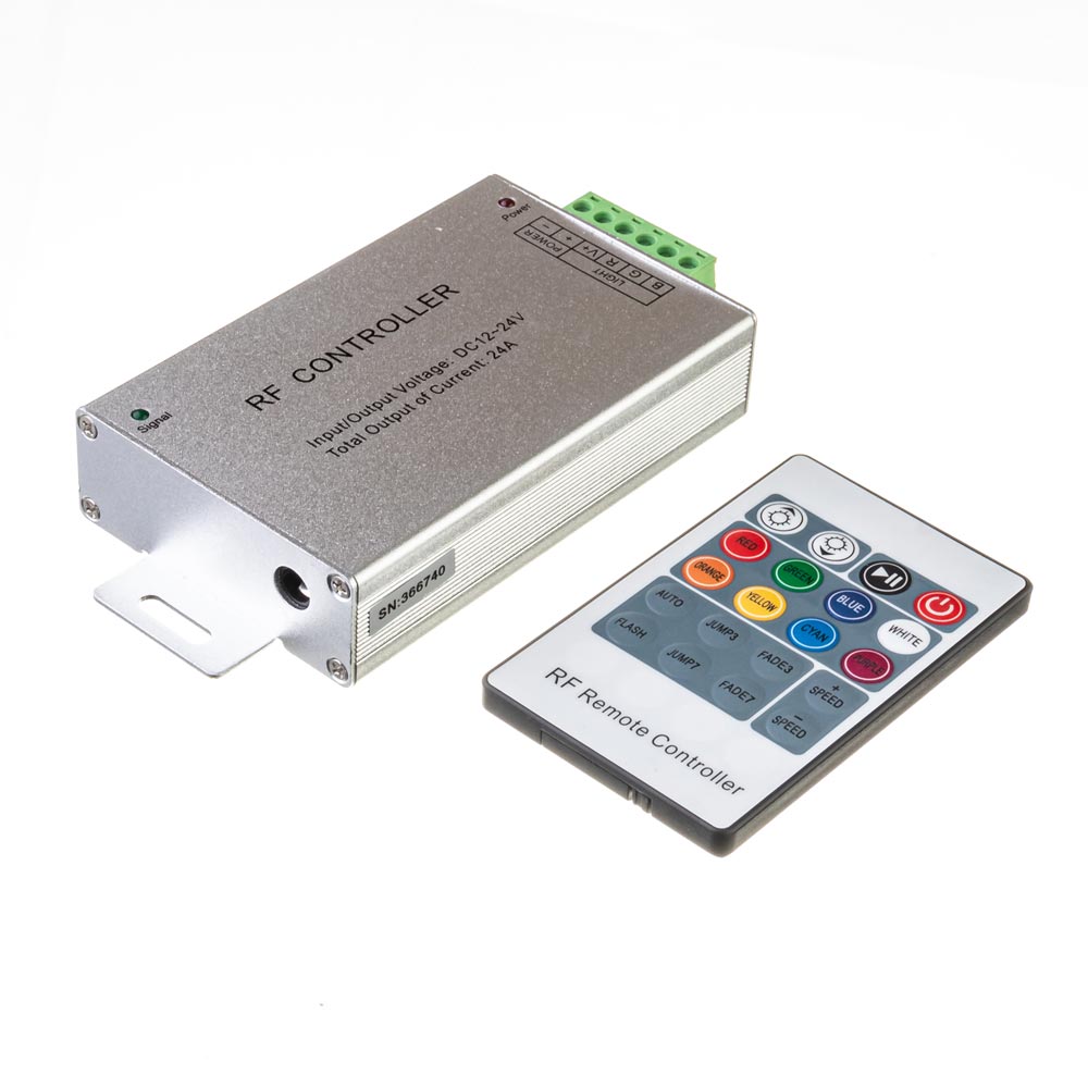 Радіус сигналу досягає до 30 м. Варто відзначити, що незначні перепони не перешкода для дистанційного регулювання контролером. Пульт функціонує в режимі RF дистанційного регулювання. Вихідний струм цього контролера становить 24А по 6А на канал.