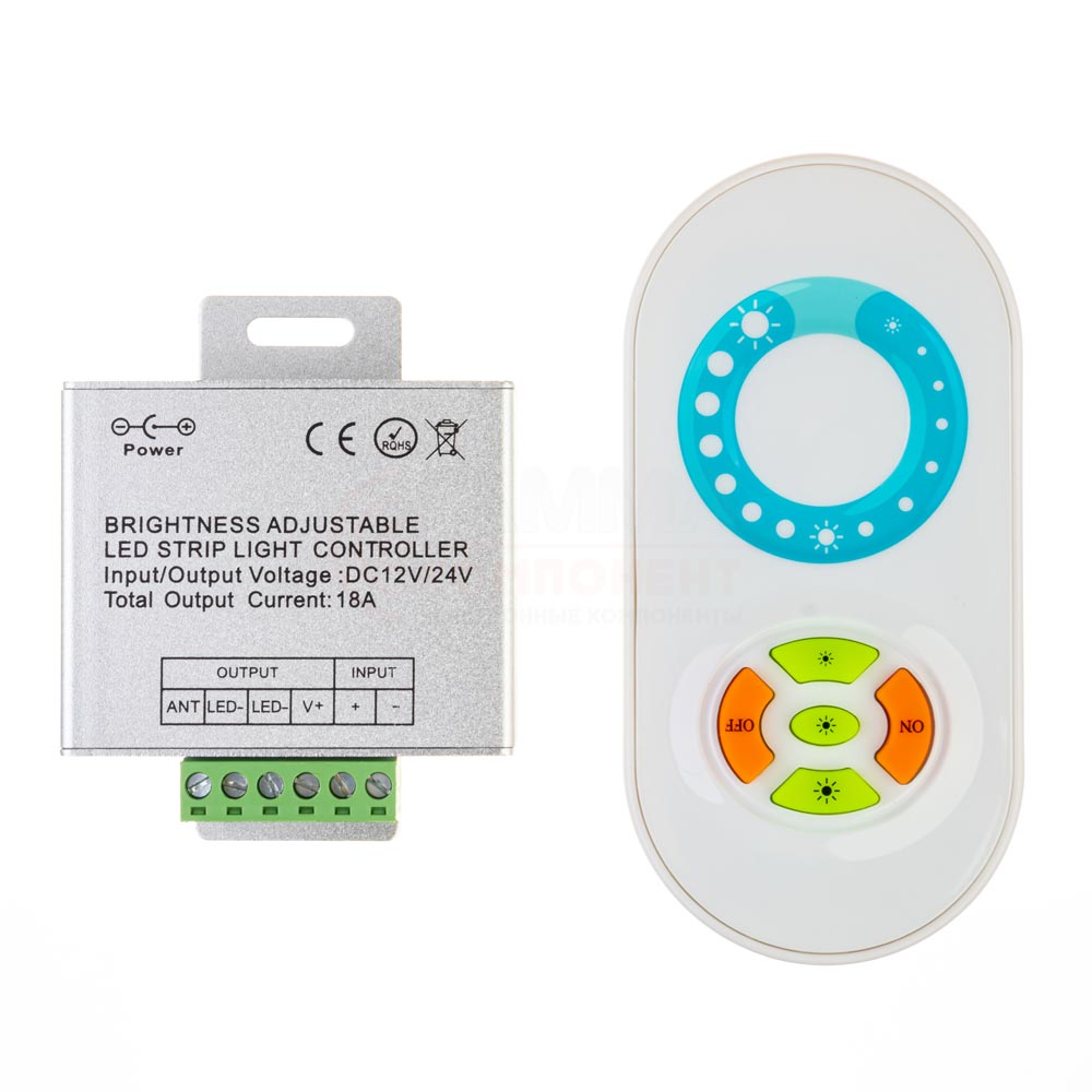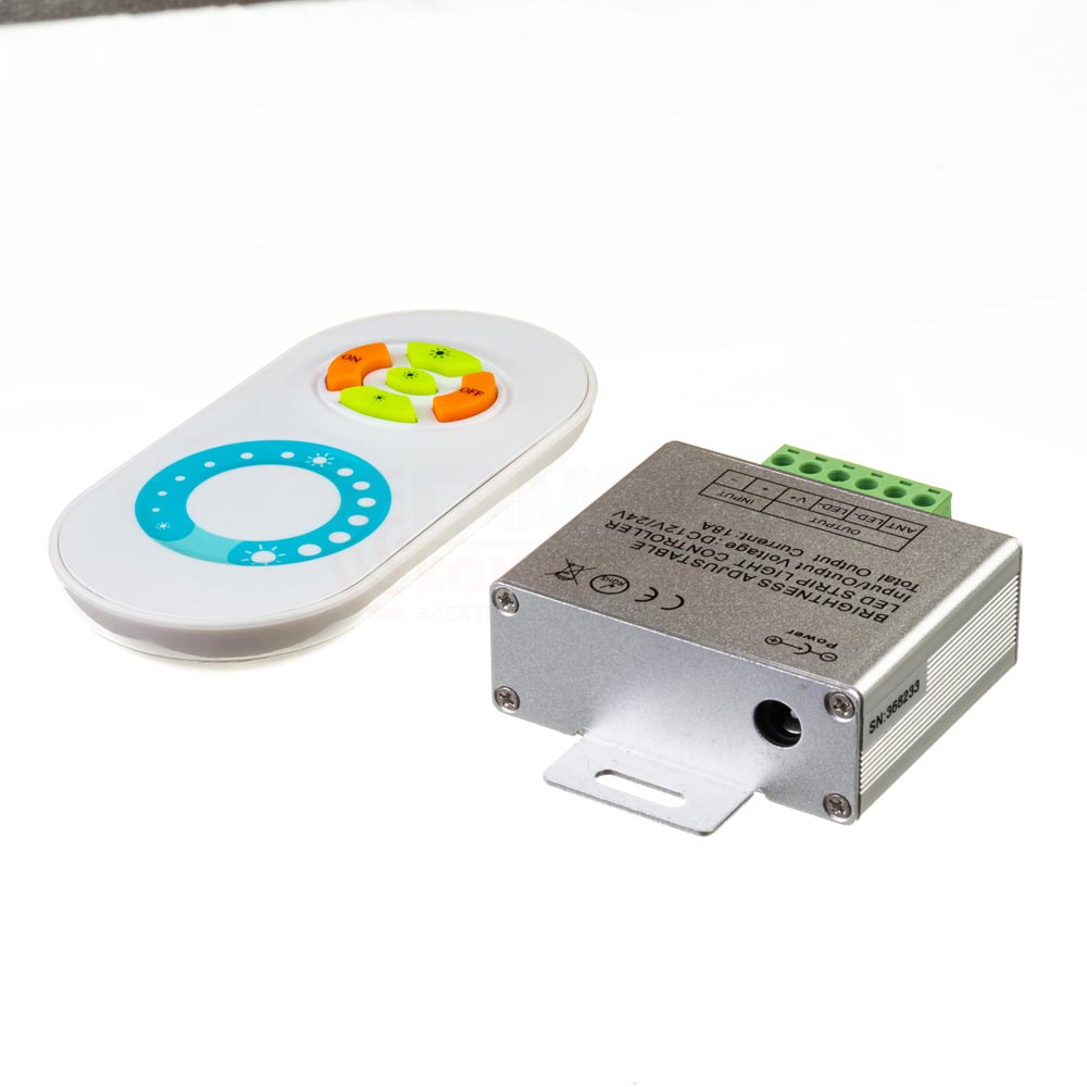 Даний диммер використовують для регулювання яскравості світла світлодіодної стрічки та інших освітлювальних елементів. Презентований диммер має в комплекті пульт управління, який працює в межах 30 метрів. Такий пульт працює на радіохвилях.