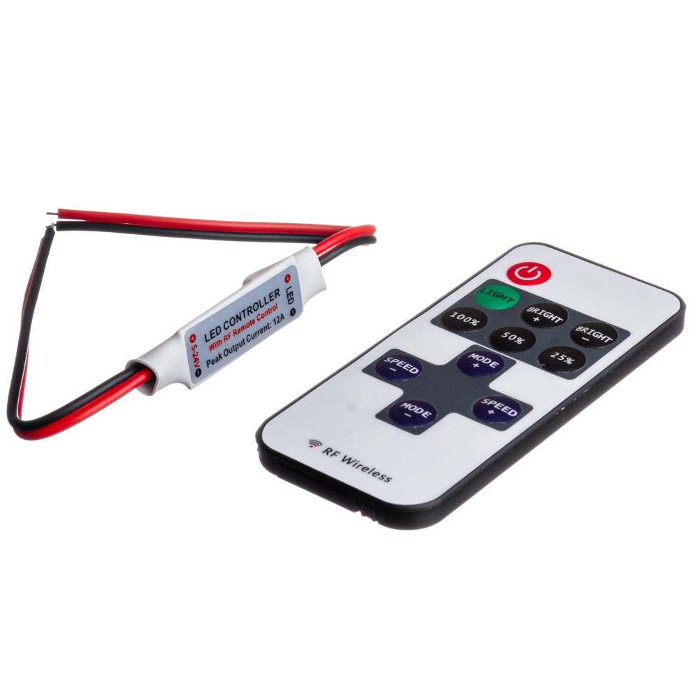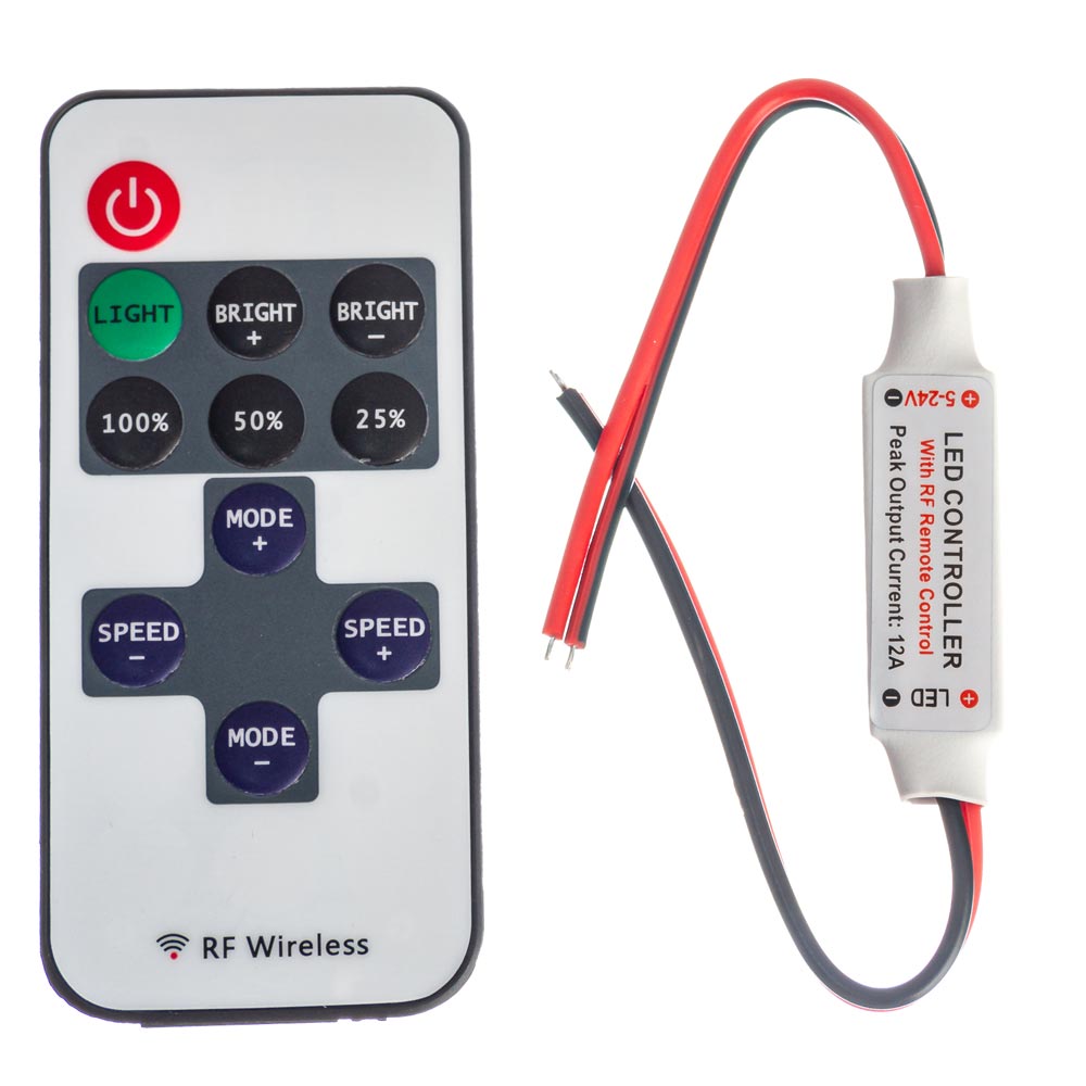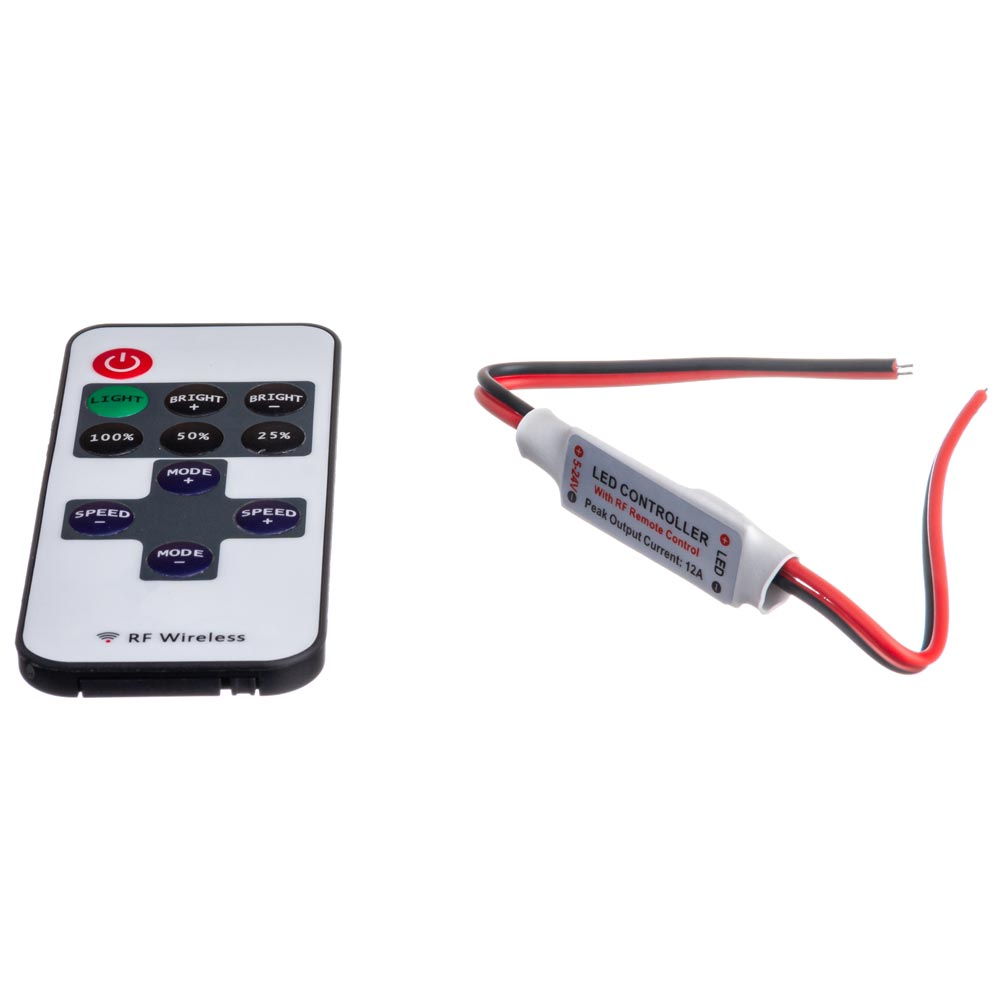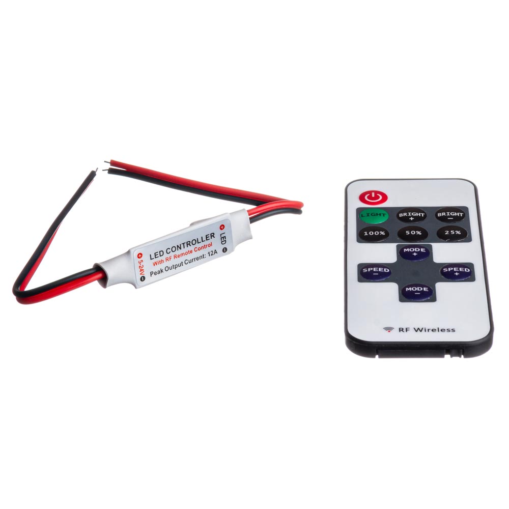 Даний диммер використовують для регулювання яскравості світла світлодіодної стрічки та інших освітлювальних елементів. Презентований диммер має в комплекті пульт управління, який працює в межах 30 метрів. Такий пульт працює на радіохвилях.